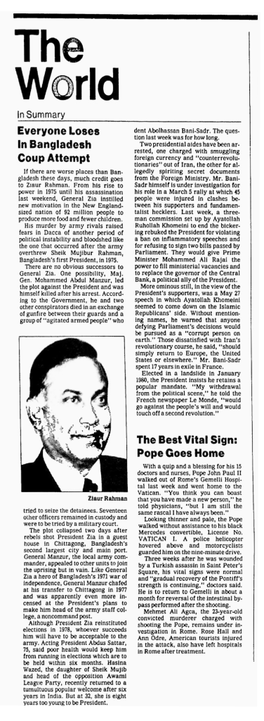The plot collapsed two days after rebels shot President Zia in a guest house in Chittagong, Bangladesh’s second-largest city and main port. General Manzur, the local army commander, appealed to other units to join the uprising but in vain. Like General Zia a hero of Bangladesh’s 1971 war of independence, General Manzur chafed at his transfer to Chittagong in 1977 and was apparently even more incensed at the President’s plans to make him head of the army staff college, a non-command post.